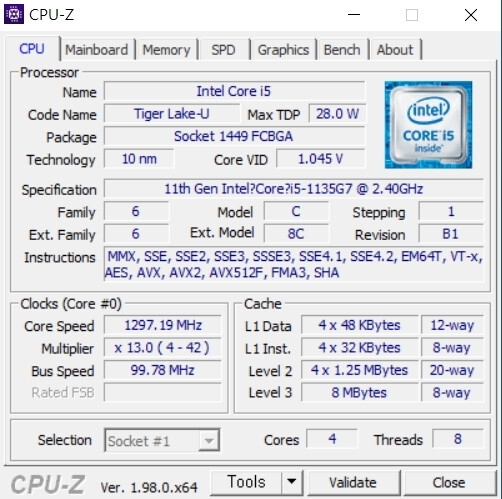 CPU-Z를 통해 좀 더 자세히 살펴보자. 28W 전력를 소비하며 10nm공정의 타이거레이크(코드명)다. L3캐시 8MB에 기본클럭은 2.4Ghz다.