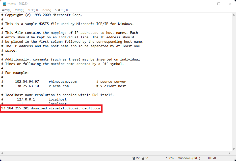93.184.215.201 download.visualstudio.microsoft.com 이부분을 마지막에 추가하고 저장해주시면 됩니다.