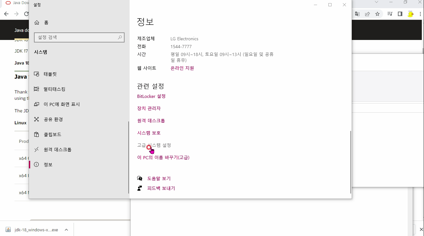 정보창이 나타나면 정보창을 스크롤아래로 내려서 고급 시스템 설정을 들어갑니다.