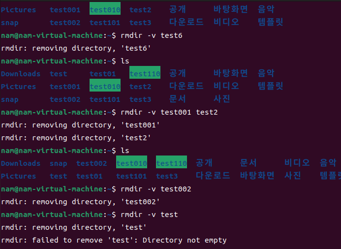 rmdir -v [디렉토리명] [디렉토리명] [디렉토리명]....