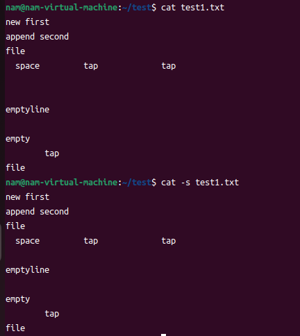 | 5 | -s | 두 번 이상 연속된 빈 라인(empty line) 출력 안함. | |