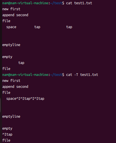 8 | -t | -vT와 결과 같음. 탭(TAB)을 포함한 nonprinting 문자 표시. | |