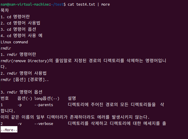 파이프(|)와 more명령으로 페이지가 넘어가는 내용을 차례로 볼 수 있습니다.