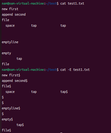 7 | -e | -vE와 결과 같음. 줄바꿈(LFD)을 포함한 nonprinting 문자 표시. | |
