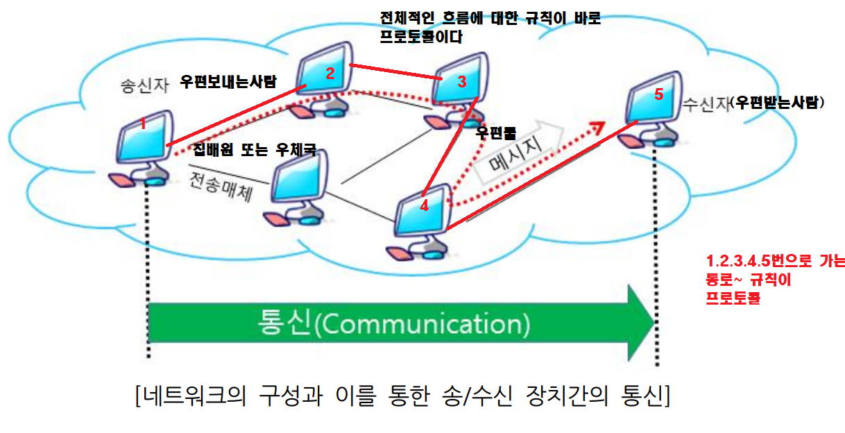 - 전송매체(집배원) : 메시지가 전달되는 물리적 경로