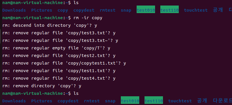 | 2 | -r,-R | --recursive | 디렉토리 내부의 모든 내용을 삭제한다. 비어 있는 디렉토리도 삭제 |