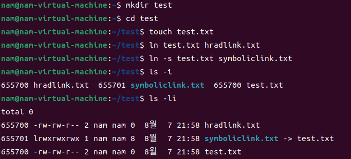 - 하드링크와 심볼릭 링크를 생성해서 ls -i 옵션을 사용하여 i-node의 번호를 확인 할 수 있습니다.