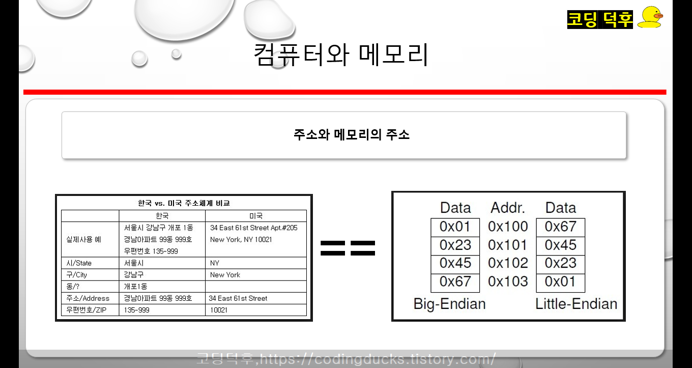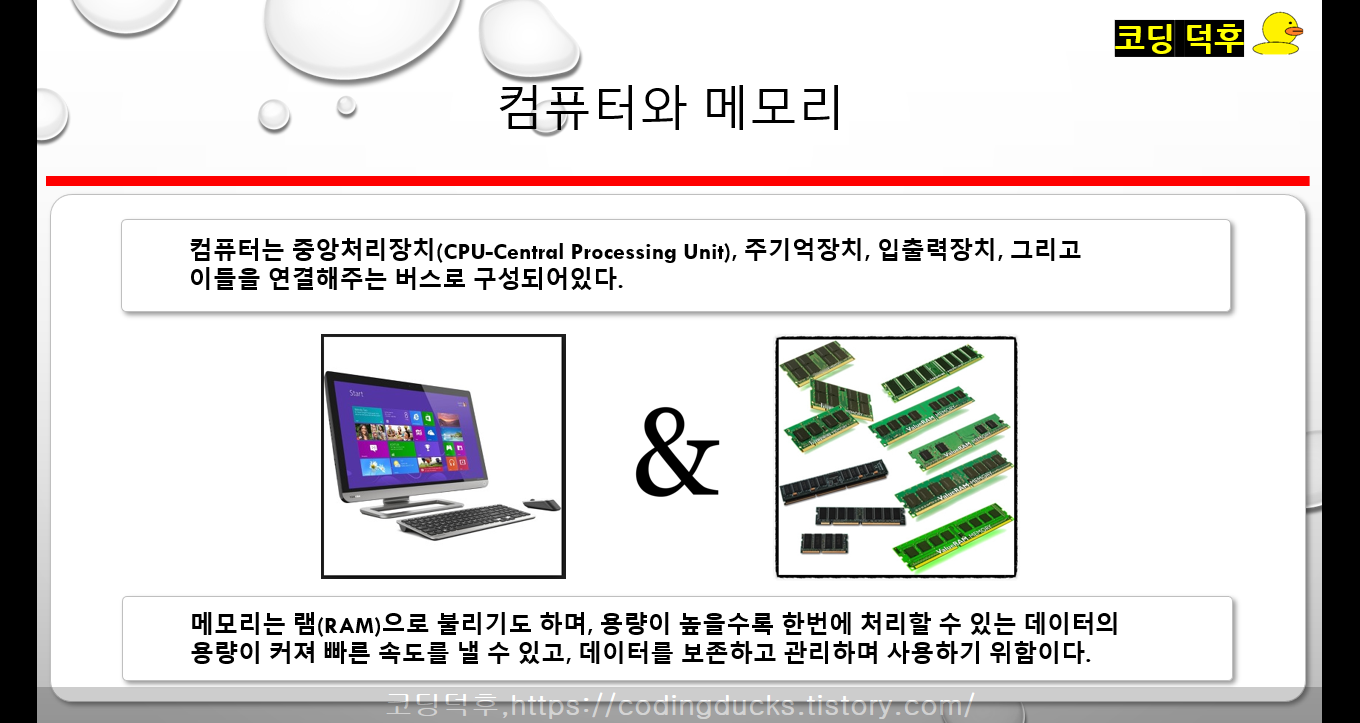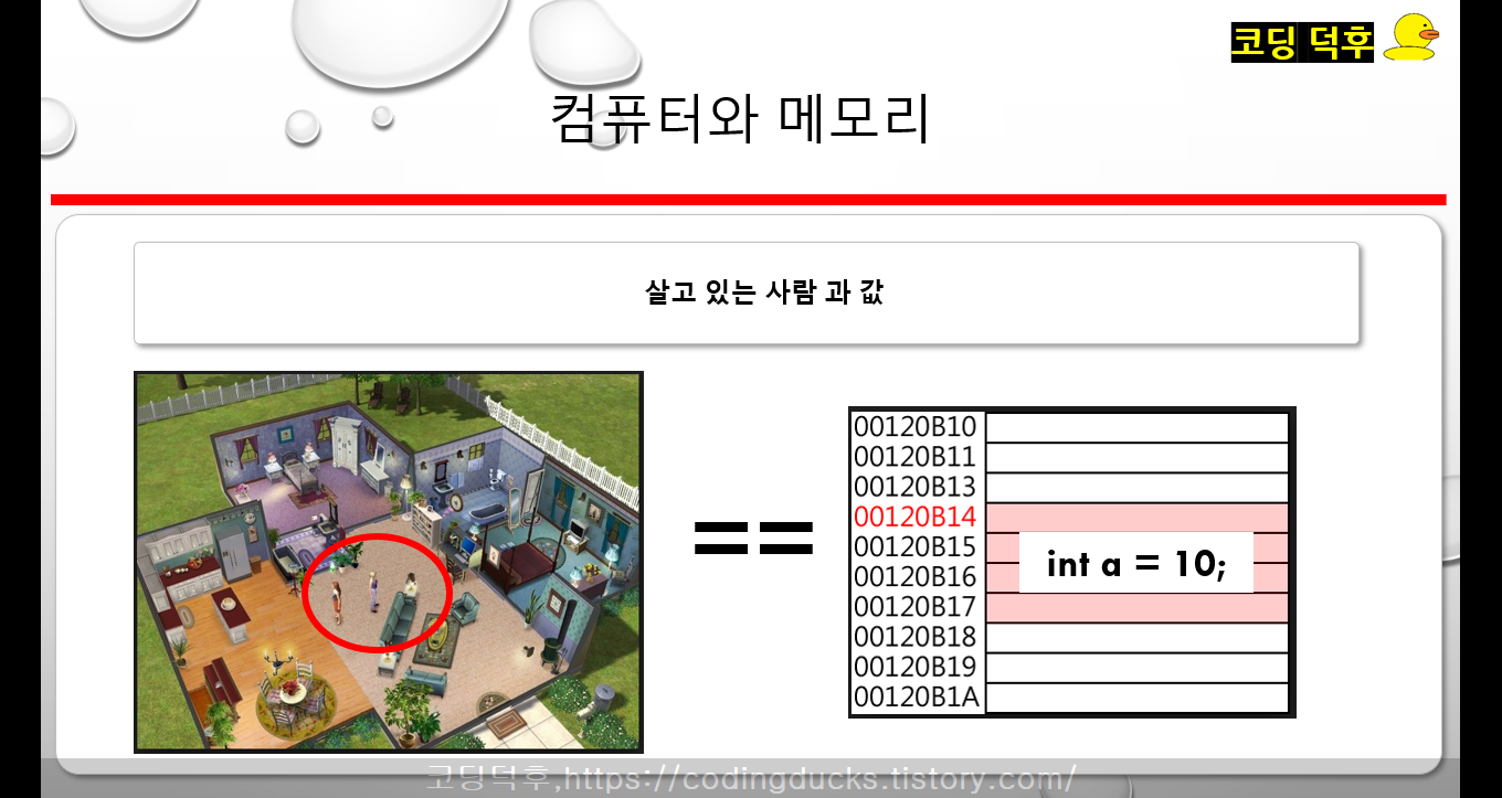 c언어를 이해하는데 있어서 컴퓨터와 메모리의 관계는 아주중요합니다. 주소 즉 메모리는 포인터와도 아주 관계가 깊습니다. 주소를 잘 이해하면 포인터도 이해하기가 좋습니다.