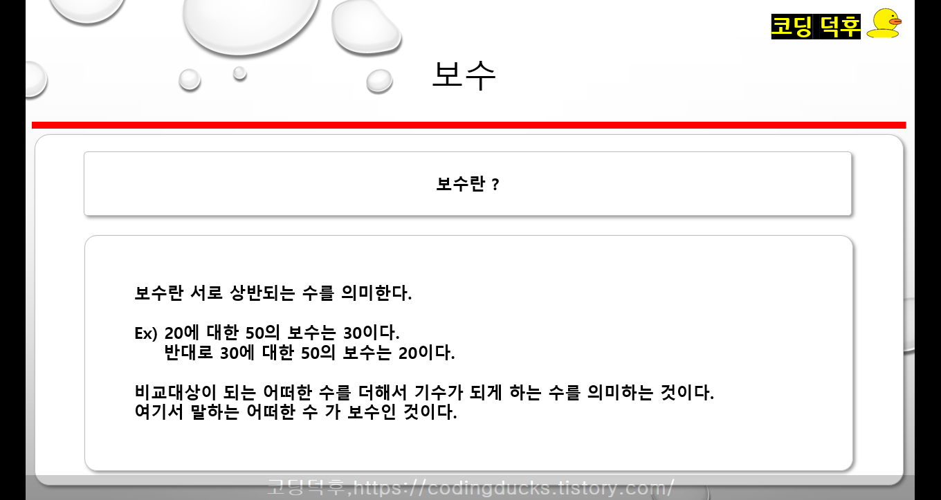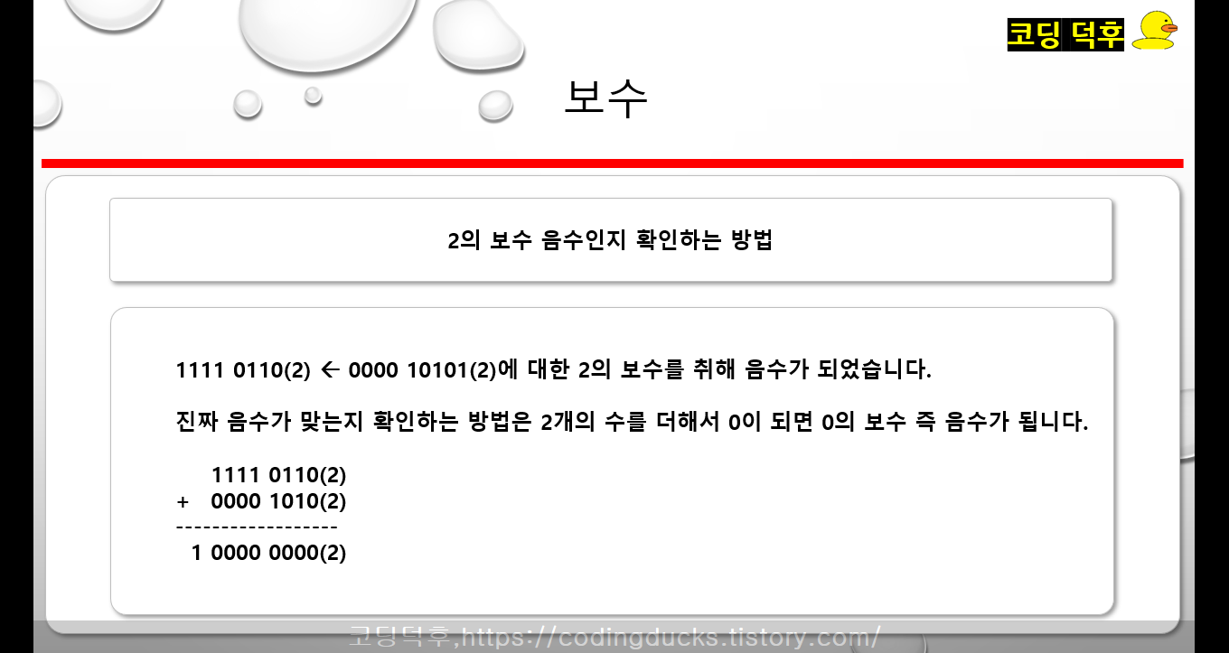 컴퓨터의 내부연산에서 보수가 사용되는 원리 1의보수,2의보수에 대한 설명등을 강의하고 있습니다.
