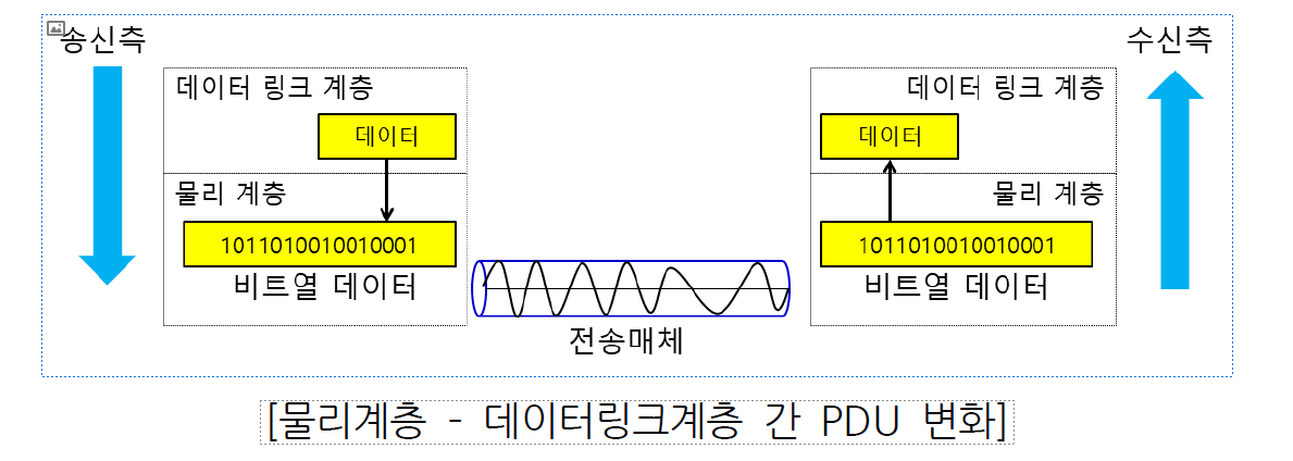 - 수신측 : 감지된 전기 신호를 0과 1로 구성된 비트열로 복원하여 헤더와 트레일러를 붙여 PDU를 생성하고 상위 계층으로 전달한다.