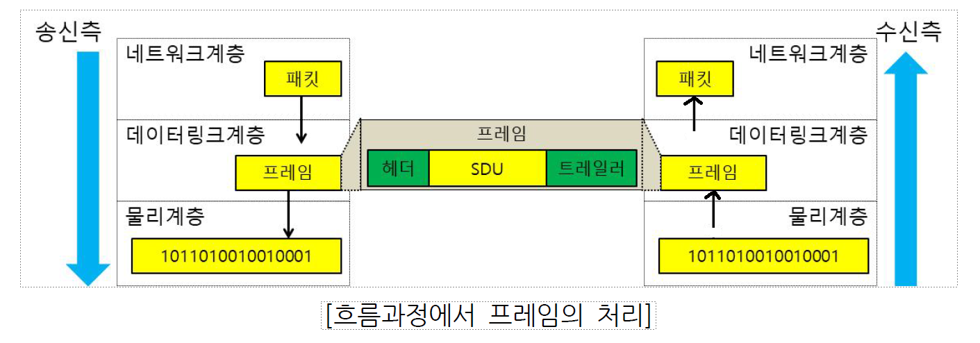 - 네트워크 계층에서 받은 데이터에 주소정보(인접노드)와 제어정보를 헤더와 트레일러에 추가