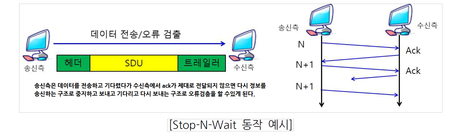 - 시스템 간에 오류 없는 데이터 전송을 위해 프레임으로 구성하여 처리(예: Stop-N-Wait)