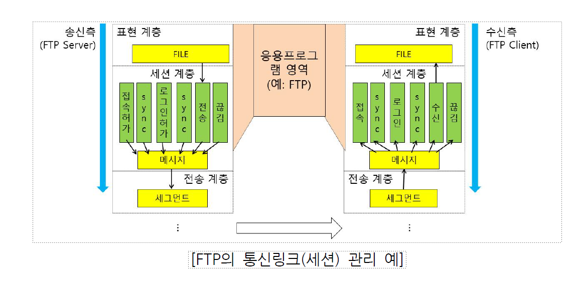 - 데이터의 단위(메시지)를 전송 계층으로 전송할 순서를 결정하고, 데이터에 대한 점검 및 복구를 위해 동기를 위한 위치(Synchronization Point)를 제공