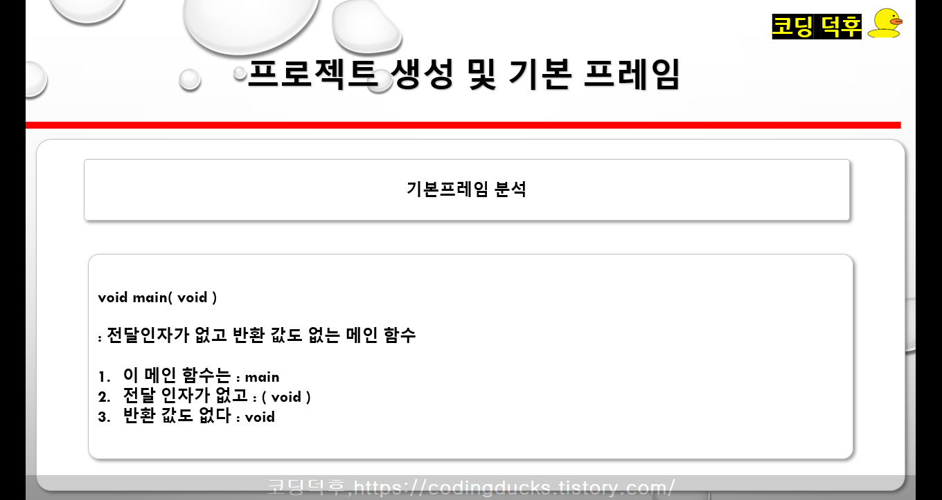 void main(void) : 이메인 함수는 전달인자가 없고 반환값이 없다.