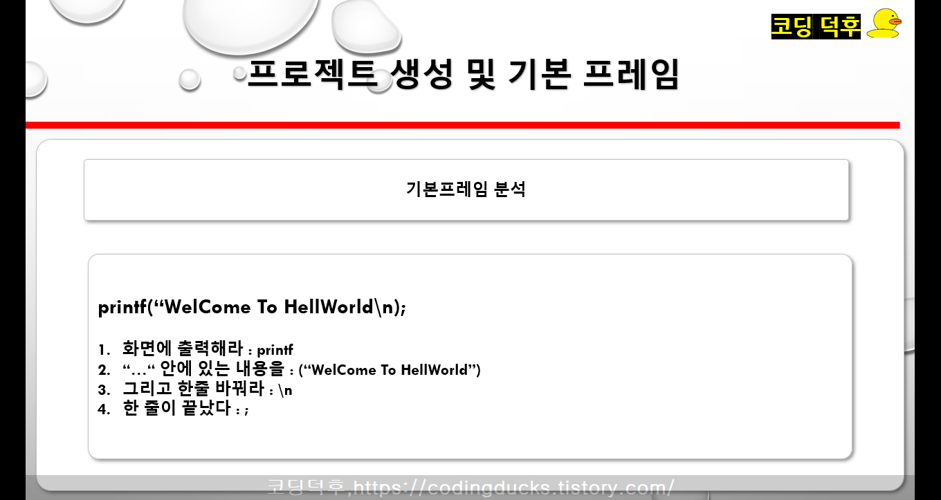 지금은 그냥 "" 사이에 있는 것들을 표준 장치(모니터)에 출력하는데 필요한 함수