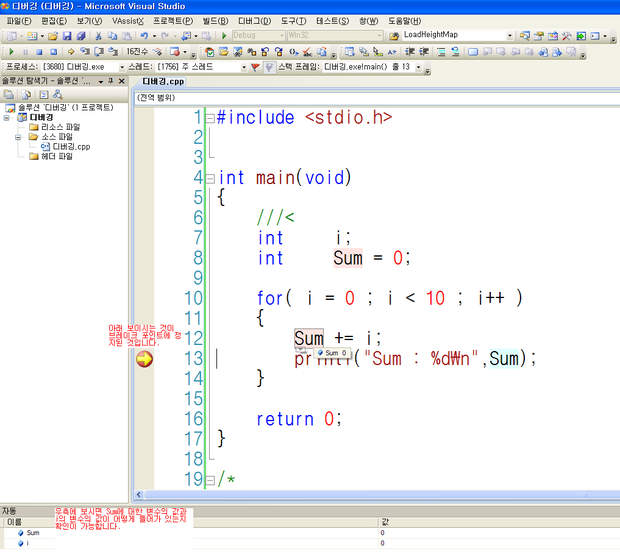그리고 난후 F10을 눌러봅니다. 프로시져 단위로 한단계씩 실행 되는것을 보실수