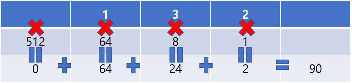 4번째 자리 : 1 * 2(3) = 1 * 8 = 8