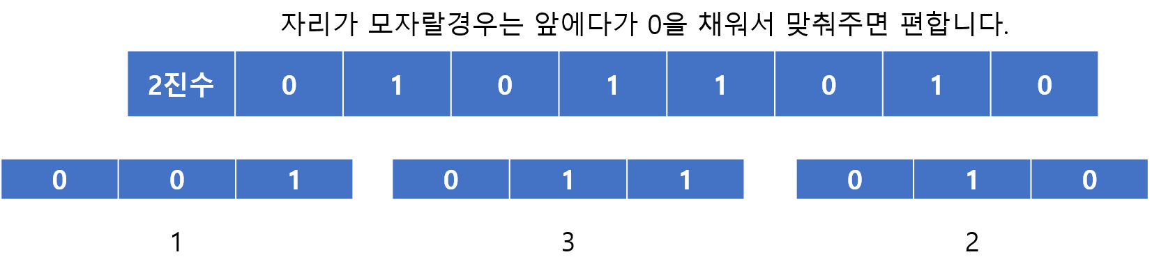 2진수는 4자리 단위로 표현이 가능합니다. 만일 자리가 모자란다면 모자란 자리수는 모