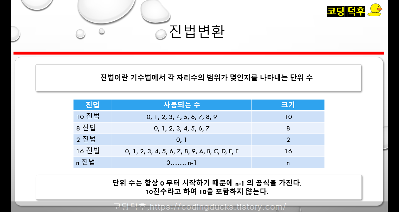 진법이라 하면 수를 표현 하기위해 사용되는 숫자의 개수라고 이해하면 편합니다.
