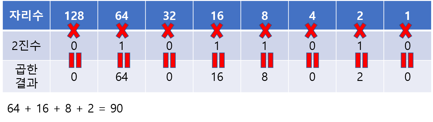 2진수 0101 1010(2)은 10진수 90이 됩니다.( 검산은 10진수를다시 2진수로 바꿔 보면 됩