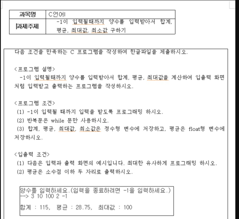 화면에 합,평균(합/입력개수(둘중하나는 실수로연산),최대값,최소값을 출력한다.
