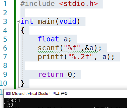 문제 설명 실수(float) 1개를 입력받아 저장한 후, 저장되어 있는 값을 소수점 셋 째 자리에서 반올림하여 소수점 이하 둘 째 자리까지 출력하시오. 참고 %.3f 와 같은 형식으로 지정하면, 소수점 이하 넷 째 자리에서 반올림하여 소수점 이하 셋 째 자리까지 출력하라는 의미이다. 입력 실수 1개가 입력된다. 출력 결과를 소수점 셋 째 자리에서 반올림 해, 소숫점 이하 둘째 자리까지 출력한다. (%.2f를 이용하면 된다.) 입력 예시 예시 복사 1.59254 출력 예시 1.59 도움말 C언어기초100제v1.2 : @컴퓨터과학사랑,...