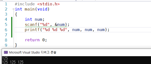 int형 정수 1개를 입력받아 공백을 사이에 두고 3번 출력해보자.