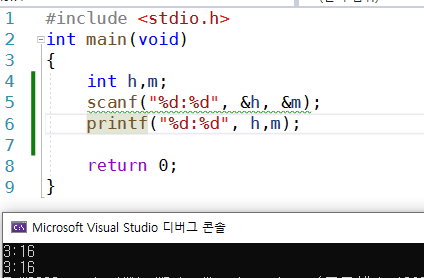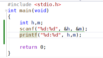scanf("%d:%d", &h, &m); //콜론(:) 기호를 기준으로 두 수가 각 변수에 저장된다.