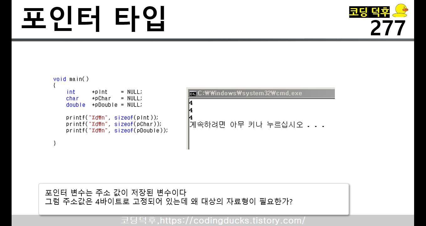 포인터의 크기는 운영체제에 따라 크기가 동일합니다.